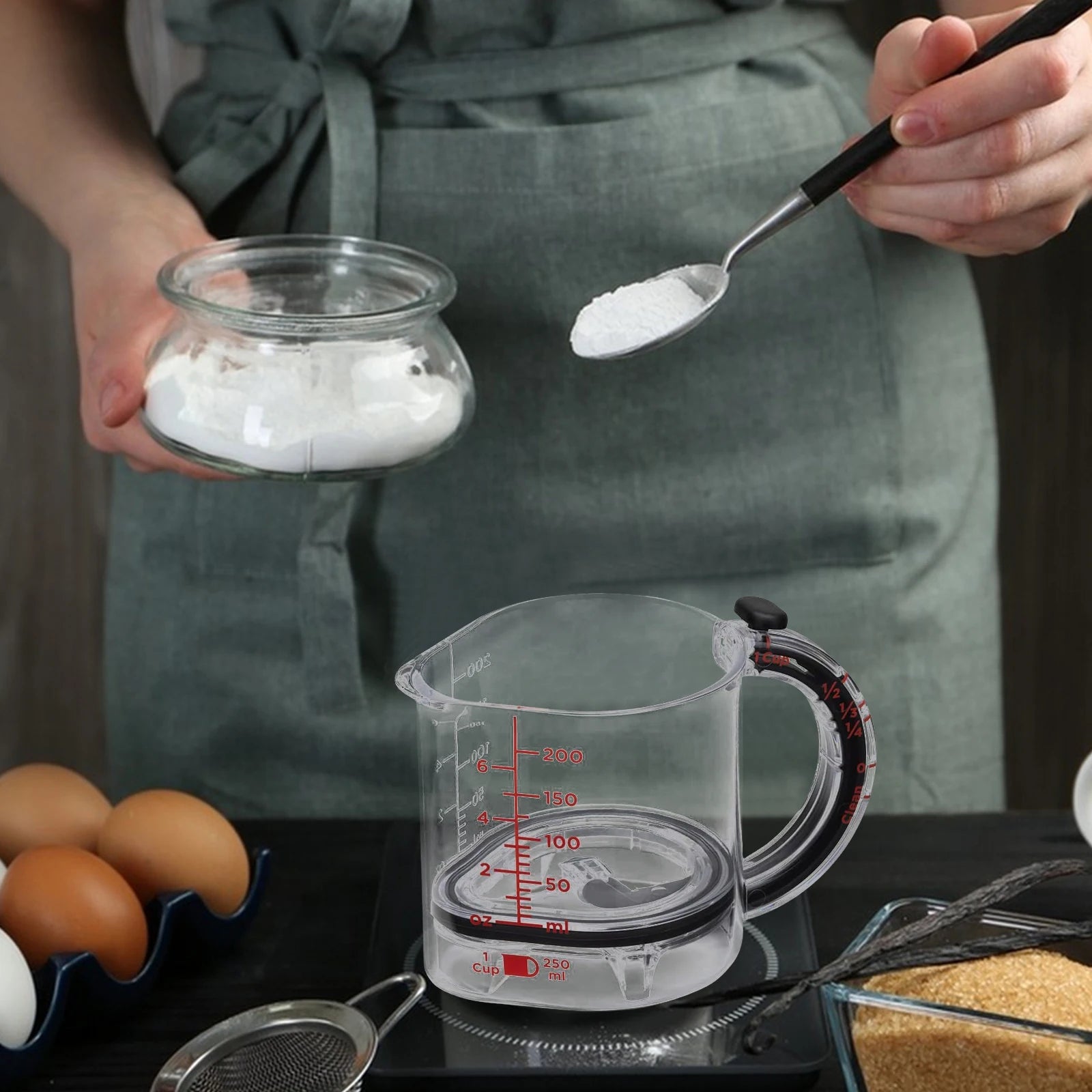 Dieser Messbecher schafft, was andere nicht können: Mit einem leichten Druck auf den Boden wird der Inhalt sauber und restlos nach oben geschoben. Kein Chaos, keine Verluste – nur perfektes Kocherlebnis.